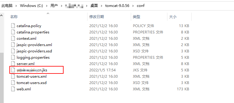 3. 将已获取到的 cloud.tencent.com.jks 密钥库文件拷贝至 Tomcat 安装目录 conf 目录下。如下图所示: