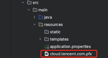 的 cloud.tencent.com.pfx 证书文件从本地目录拷贝至 Spring Boot 项目的 src/main/resources 目录下。如下图所示: