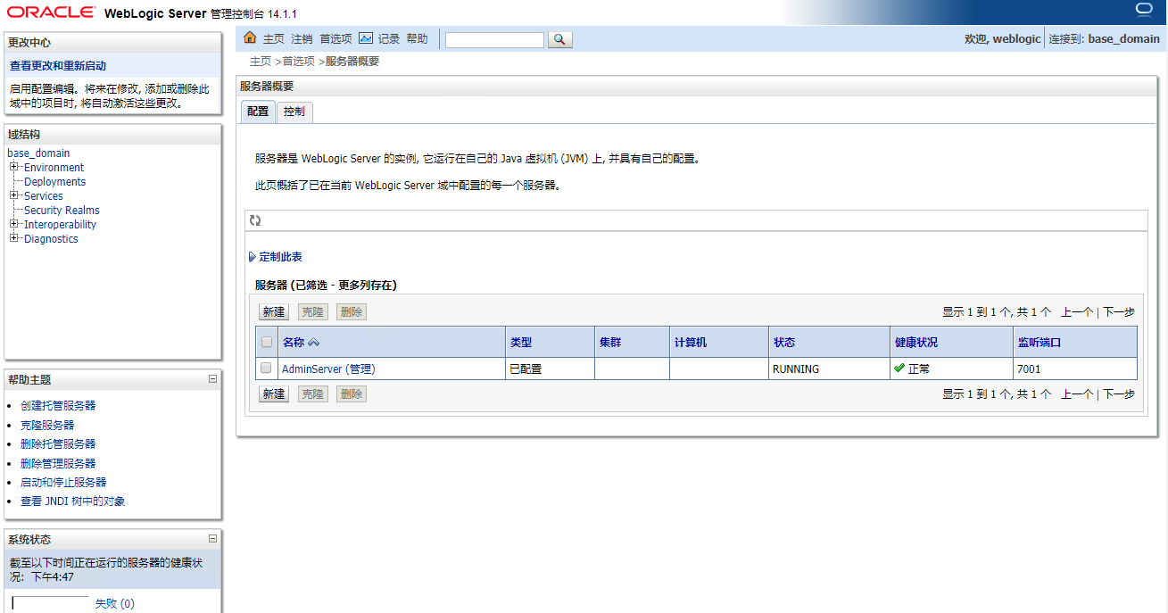 5. 请登录  WebLogic 服务管理后台(默认地址:http://localhost:7001/console),输入您的用户名及密码,即可进入 WebLogic Server 管理控制台。