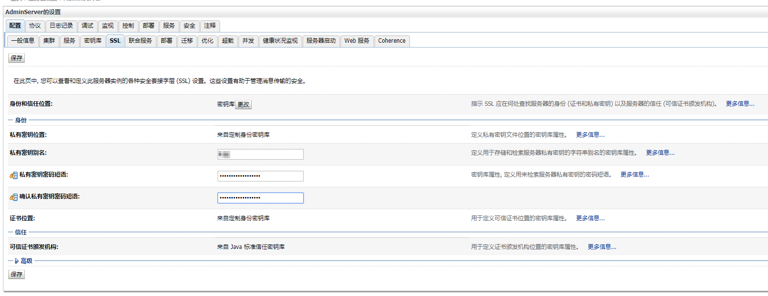 10. 在 AdminServer 的管理设置页面,单击 SSL,设置完成后并单击保存。如下图所示: